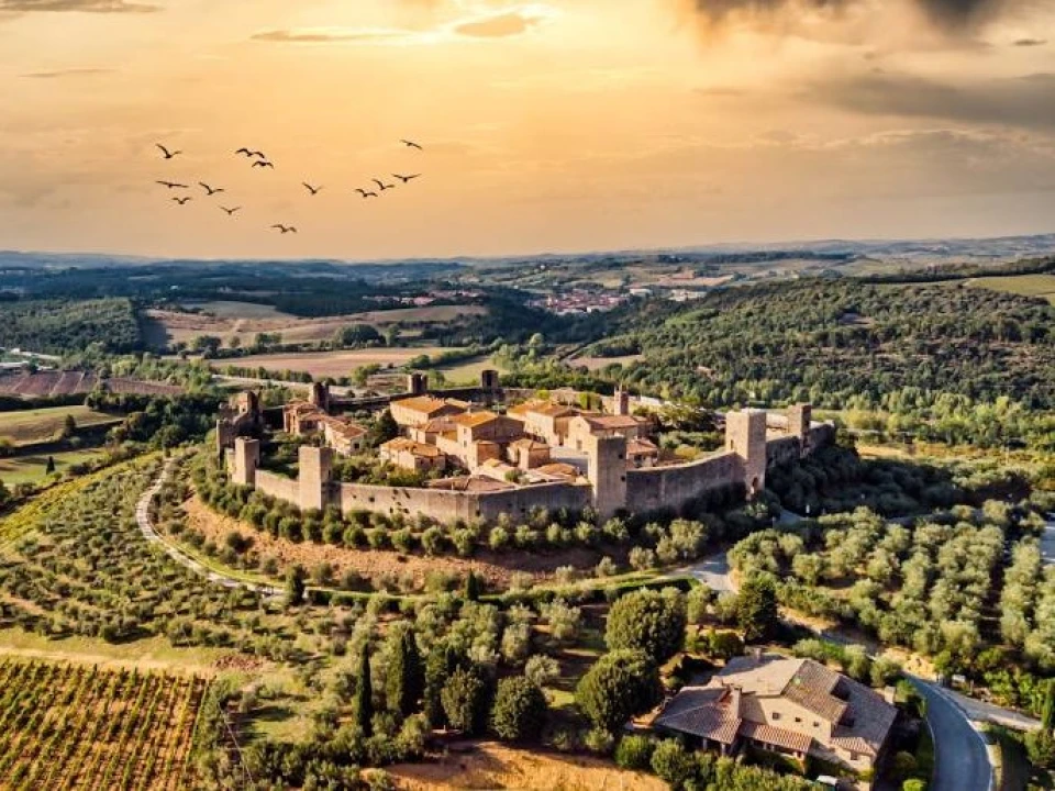 The road from Siena to Florence has been in use for centuries, passing through charming villages, fields bursting with flowers, and gently rolling countryside. About 20 minutes north of Siena, along one bend of the road, an impressive skyline suddenly springs up: it’s the castle wall and fortified towers of Monteriggioni, a garrison town founded in the early 1200s.