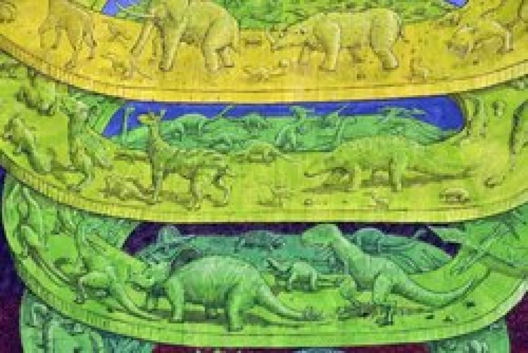 Blu's colourful spiral image depicts evolution, beginning at the base with amoebas, continuing upwards through pre-historic fish, reptiles, dinosaurs, birds, elephants, apes and finally Homo Sapiens, tracing mankind's journey from agriculture to heavy industry, war and overdevelopment. It is at this point that the mural reaches a shuddering end, when the modern world breaks into pieces and comes tumbling down.