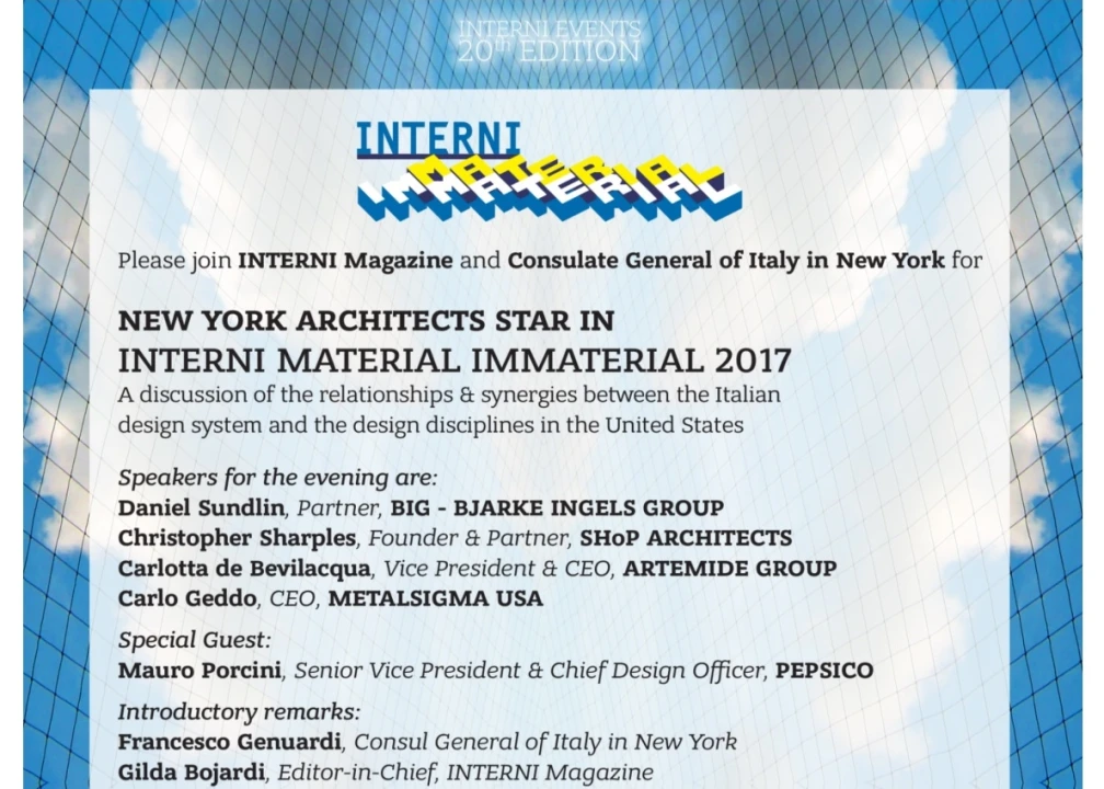 INTERNI AND THE CONSULATE GENERAL OF ITALY IN NEW YORK PRESENT “NEW YORK ARCHITECTS STAR in MATERIAL IMMATERIAL 2017”, AN ENCOUNTER ON THE ITALIAN DESIGN SYSTEM AND THE DESIGN DISCIPLINES IN THE UNITED STATES. The protagonists include two of the most interesting architecture studios on the international scene based in New York: BIG - Bjarke Ingels Group and SHoP Architects