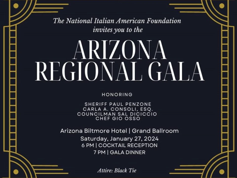The gala will also present the 2024 Tomaso Maggiore Culinary Excellence Award to acclaimed Chef Gio Osso, Owner of Virtu Scottsdale and the 2024 Al Carfora Italian Heritage Award will be bestowed upon Phoenix City Councilman, Sal DiCiccio.