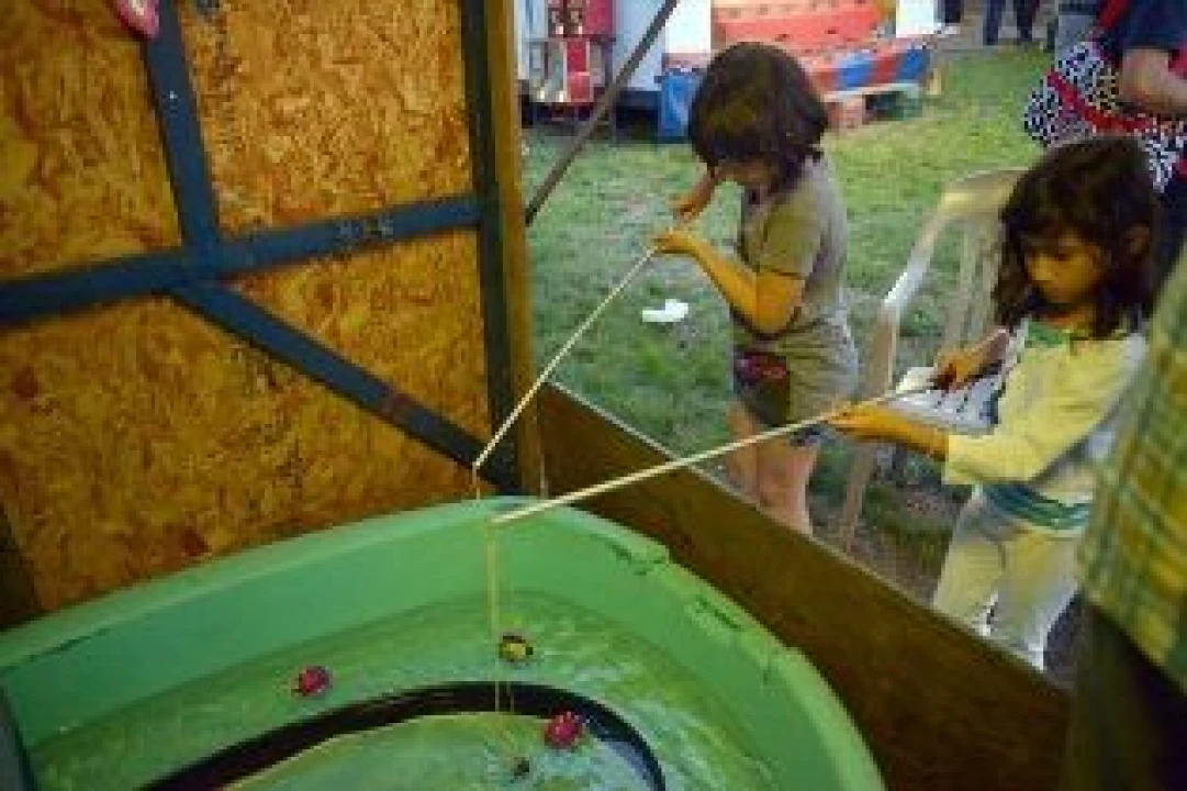 On Friday evening, Steve Gross sat at his fish pond booth drawing on his pipe and waiting for customers, while the air was filled with the scent of grilled hamburgers and the sound of rock 'n' roll from DJ Vin D.