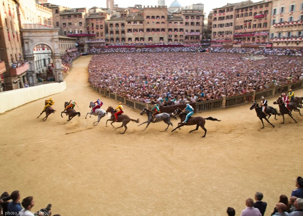 “Huge outdoor loony bin” is not the most precise description of the Palio di Siena, the thunderous, lawless, bareback, medieval-style horse race held twice each summer in front of tens of thousands of spectators on a track of packed clay laid down in the downtown heart of Siena, in Tuscany. But it will do for the moment.