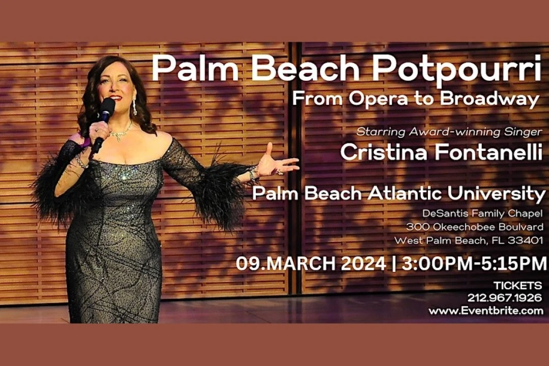 Join us for an unforgettable afternoon of the world's greatest music at the DeSantis Family Chapel. On Saturday, March 9, 2024, at 3:00 PM (Eastern Daylight Time), the talented and renowned singer/PBS-TV host for Andrea Bocelli and star of title roles at the Palm Beach Opera, Cristina Fontanelli Cristina Fontanelli – Opera, Classical-crossover and Award-winning Singer / PBS-TV Host / Producer, will take the stage along with local young talent, to transport you from the world of opera to the enchanting realm of Broadway.