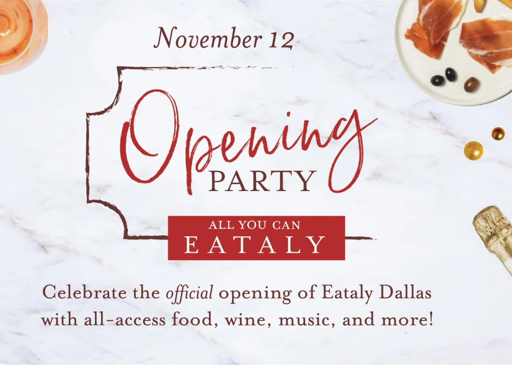 Ciao Dallas, get ready to party... Italian style! Eataly Opening Party: All You Can Eataly is coming November 12 and we are ready to raise a glass and officially celebrate the opening of our Italian marketplace.
