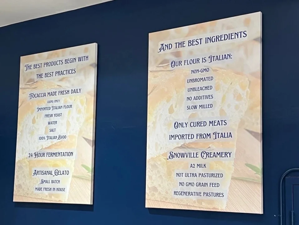 The space has been given a bright makeover, with new wooden floors, blue walls, and colorful umbrellas hanging over the retail shop. As you enter the doors, on the right side is the kitchen and ordering counter, while on the left is the retail space. Their menu currently features six sandwiches, gelato, and water.