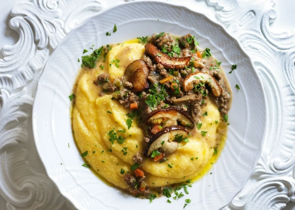 Polenta is traditionally prepared in a paiolo, a large copper pan tapered at the bottom, and stirred with a long wooden paddle called a tarai. In Italy, polenta is often eaten family-style from a large platter or wooden board, allowing guests to serve themselves at the table.