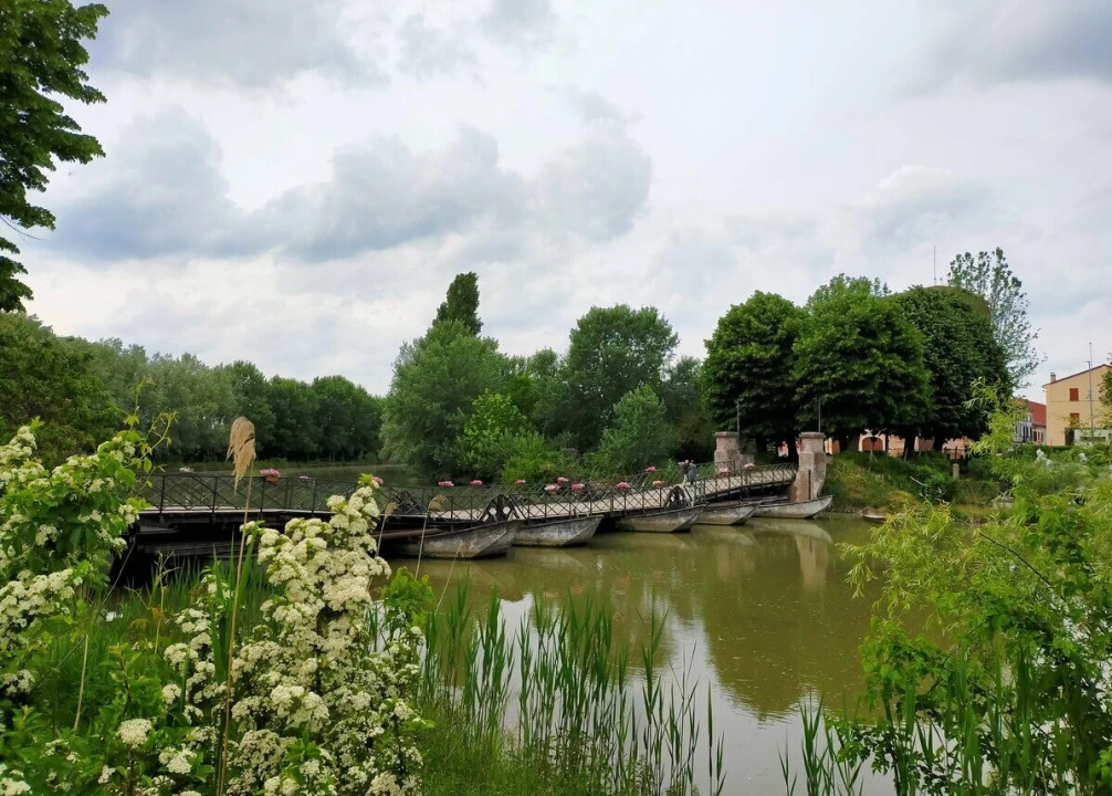 THIS PONTOON BRIDGE WAS BUILT in 1976 to replace a historical bridge built in the 14th century by the Duke Vespasiano Gonzaga. The old bridge was demolished because was considered hazardous by the Sabbioneta municipality (the bridge was on the edge between Commessaggio and Sabbioneta municipality).