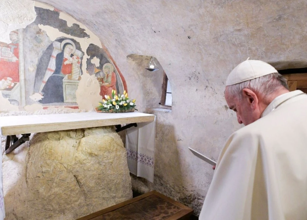 During his brief trip to Greccio on Sunday afternoon, Pope Francis paused to pray at the site where Saint Francis of Assisi created the first nativity scene. The small grotto resembles the tiny cave of Bethlehem where the Virgin Mary gave birth to Jesus.