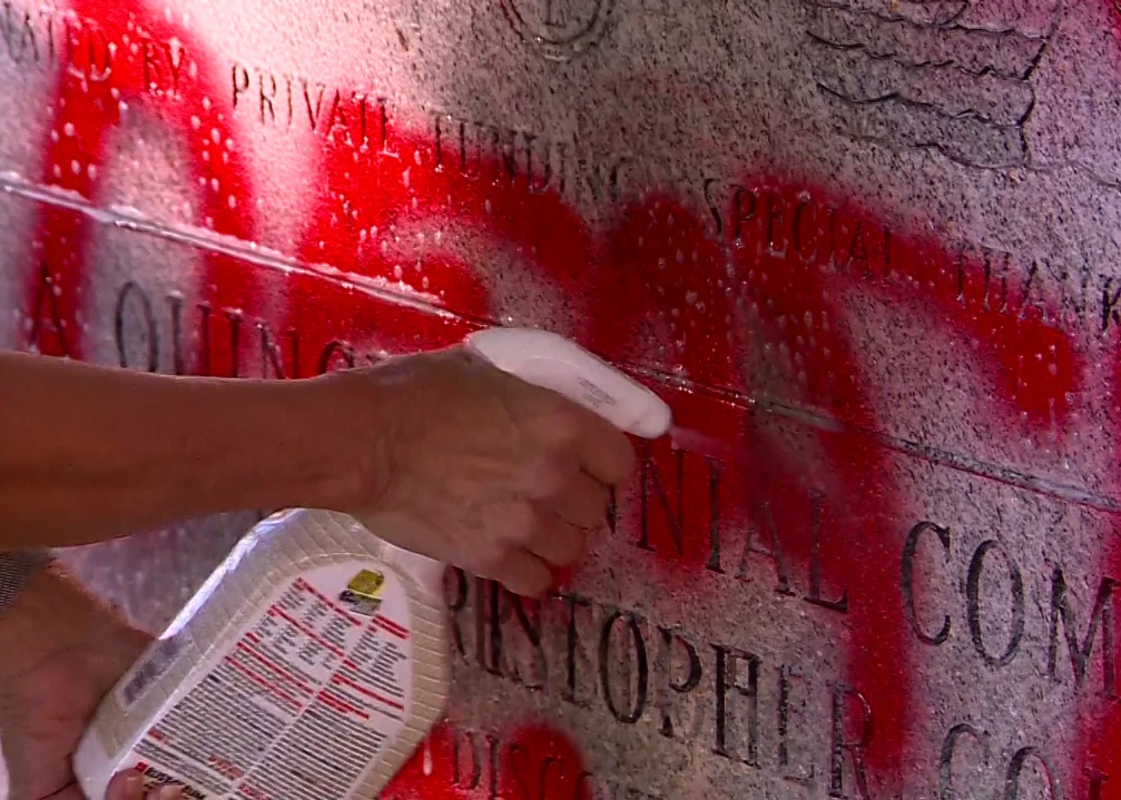 Red graffiti sprawled on Christopher Columbus monument in Waltham, MA
