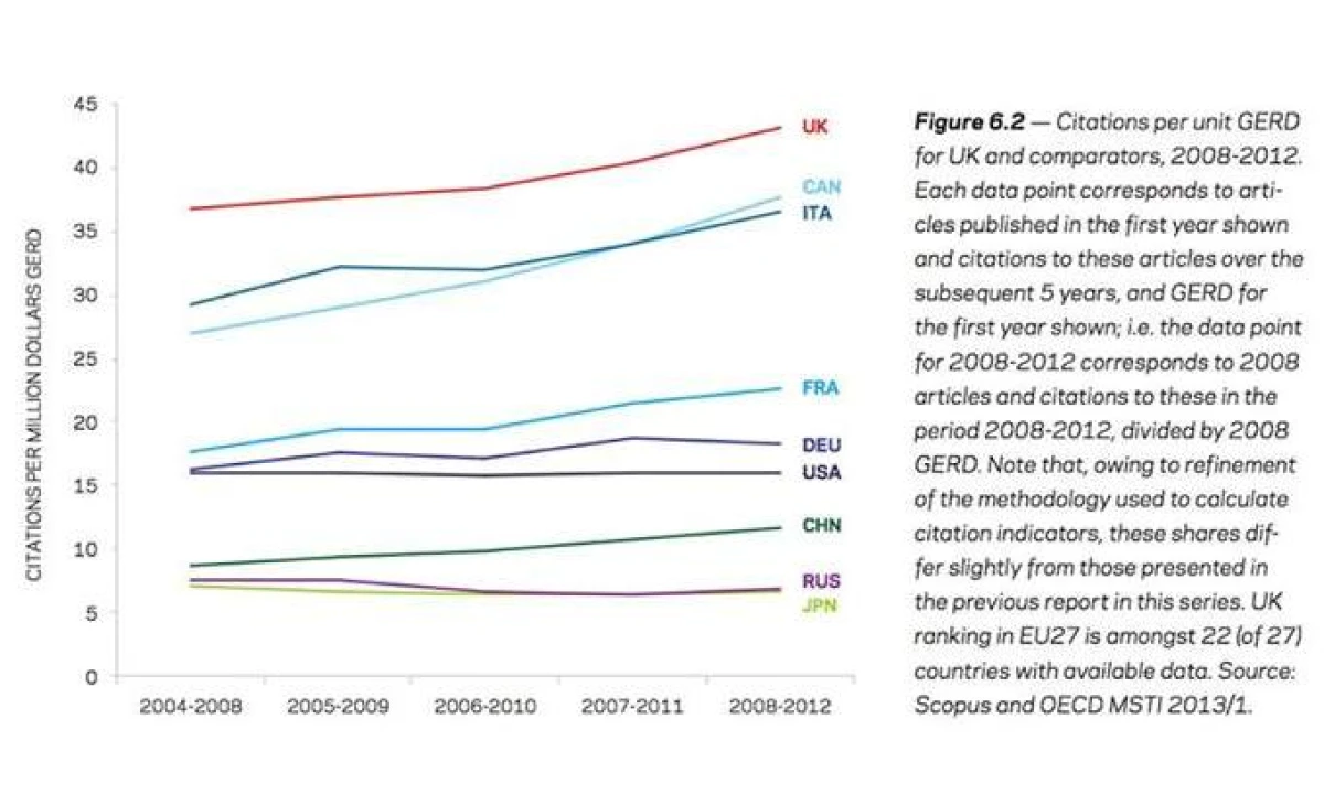 Questo è quanto viene mostrato da uno studio commissionato dal governo britannico. In particolare, gli analisti della casa editrice Elsevier mostrano che gli Stati Uniti sono stati superati nella classifica (normalizzata per disciplina) dal Regno Unito nel 2006 e dall'Italia nel 2012, anche se gli Stati Uniti rimangono ben avanti in termini di quota mondiale del top 1% degli articoli più citati.