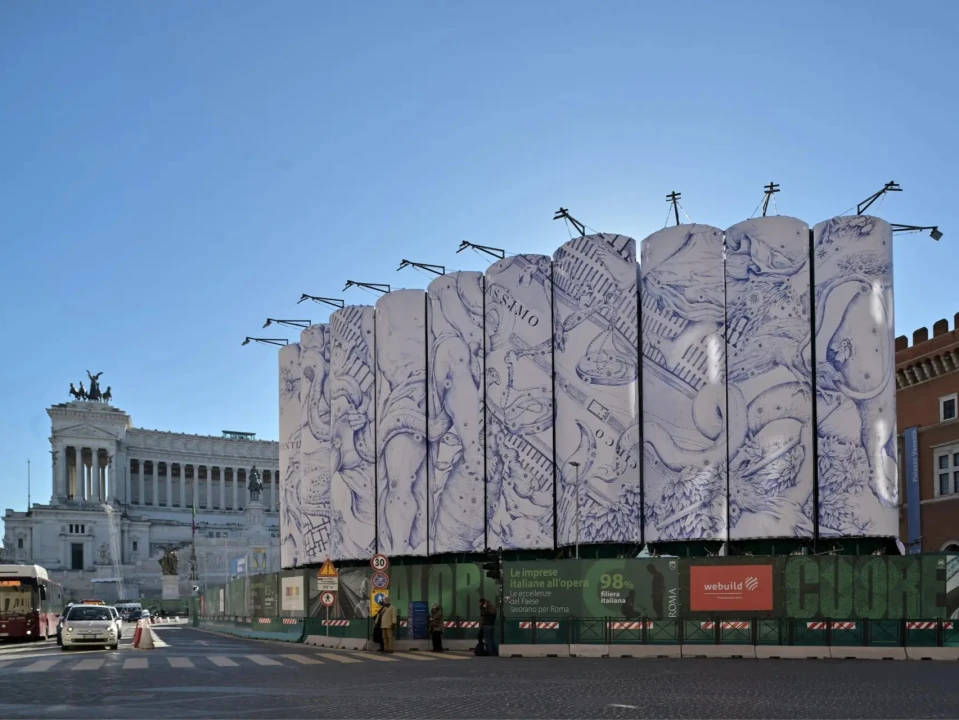 Rome mayor Roberto Gualtieri inaugurated the project with the unveiling of Ruffo's Costellazioni di Roma, a blue and white mural that recalls constellations and legends associated with the city. Ruffo, whose work is currently the focus of a major exhibition in Rome, said that creating a site-specific work in Piazza Venezia was a chance to "leave a trace in the historic fabric of this city".