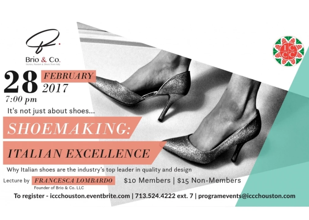 Join us at the ICCC for an evening to celebrate the “Made in Italy,” excellence in Italian craftsmanship and design, Tuesday, February 28, 2017 at 7:00 pm. Francesca Lombardo, founder and owner of Brio & Co. LLC, will present an interesting lecture on how and why Italian shoes are the industry’s top leader in quality and design. Guests will learn about the history and aspects of the “Made in Italy” brand, as well as the reasons why Italy is an industry model to follow to achieve success.
