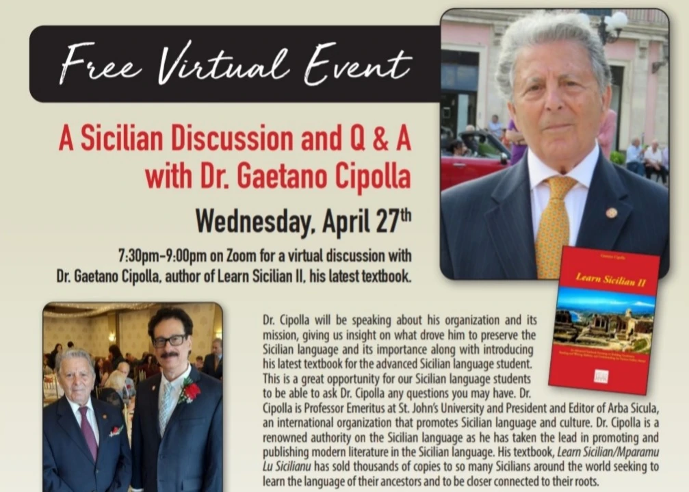 Dr. Cipolla will be speaking about his organization and its mission, giving us insight on what drove him to preserve the Sicilian language and its importance along with introducing his latest textbook; Learn Sicilian II for the advanced Sicilian language student. This is a great opportunity for our Sicilian language students to be able to ask Dr. Cipolla any questions you may have.