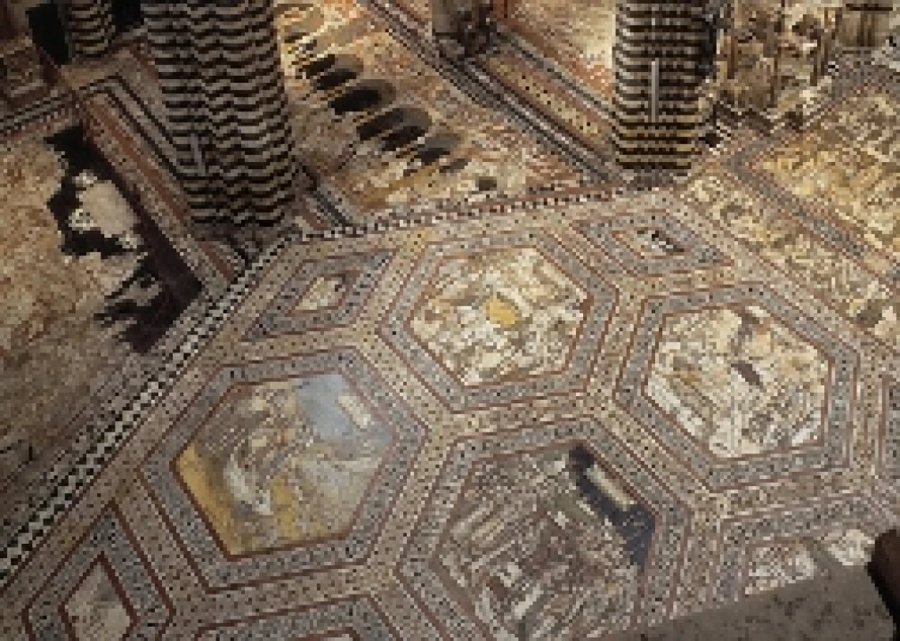 Crafted by about forty artists and artisans between the 14th and 16th centuries, the 56 panels that constitute the floor vary in size and shape – most of them have a rectangular shape, some a hexagon or a rhombus one – and are made mainly by two different techniques: one known as graffito (tiny holes and cutting lines created in the marble and then filled with black stucco and mineral pitch) and the one called "marble intarsia" (black, white, green, red and blue marble employed in much the same manner as wood inlaying).