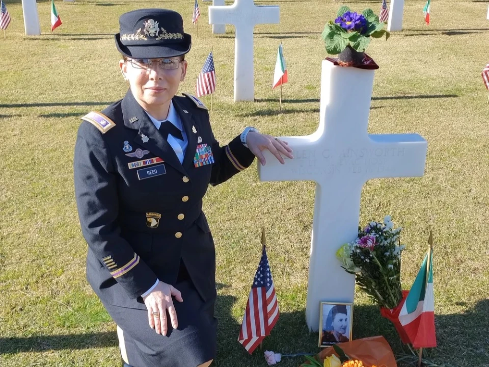 During the ceremony, school children from Nettuno shared the stories of 2nd Lt. Ellen Ainsworth and Pvt. Toshio Sasano, two Soldiers buried at the cemetery. Ainsworth was assigned to the 56th Evacuation Hospital and was posthumously awarded the Silver Star. Sasano was assigned to the 442nd Regimental Combat Team and was posthumously awarded the Bronze Star.