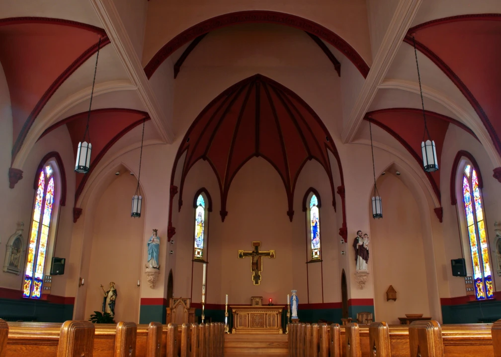 The current church was constructed in 1877 (140 years ago). It is the oldest Catholic church in the city of Kankakee. The beautiful stained-glass windows were constructed in Germany, imported and installed 107 years ago. Many aspects of St. Rose are like a living art museum. There are near life-sized statues above and around the altar. The Stations of the Cross are in three-dimensional color. Two huge canvases depict the Nativity and the Crucifixion.