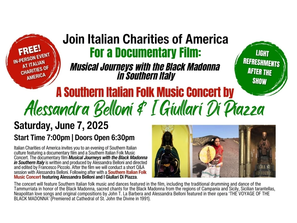 Join Italian Charities of America For A Documentary Film Screening of Musical Journeys with the Black Madonna in Southern Italy & A Southern Italian Folk Music Concert by Alessandra Belloni & I Giullari Di Piazza. In-Person Event on Saturday, June 7 at 7:00pm - Doors Open at 6:30pm. 83-20 Queens Blvd, Elmhurst, NY. Click Here To Reserve Your Seat.