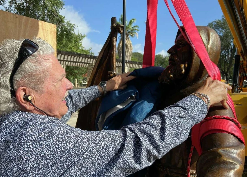 The crane operator shifted gears to hoist the sculpture upon the 5-foot-tall base. With two hands, a site manager guided the bottom of the statue, held by red safety straps, onto the pedestal. He bore down on a hand-held drill that made high-pitched squeals as he rounded the openings.