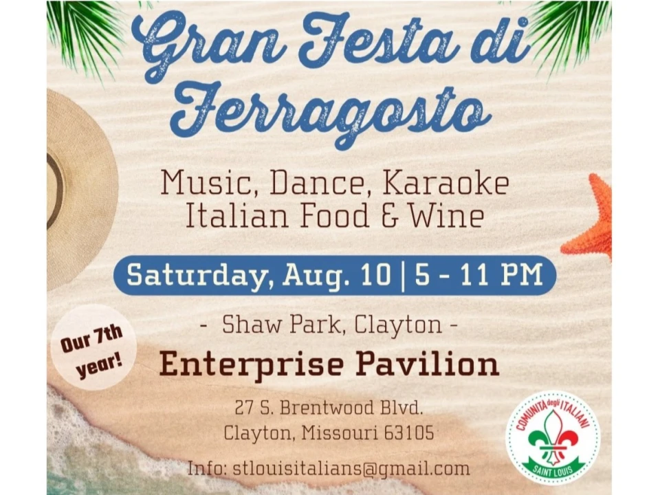 On Saturday, August 10, 2024, the Italian Community of St Louis is excited to host the 7TH ANNUAL FERRAGOSTO from 5pm to 11PM. TICKETS: $10 PER ADULT. Children 12 and under are FREE. Besides music and entertainment, Italian wines, and beer will be provided as well as traditional pastas and meats made by Chef Alessandro Valentino.
