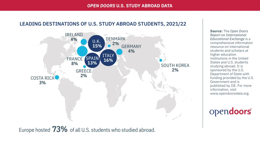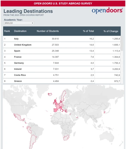 Il rapporto Open Doors rilasciato dal Ministry of Foreign Office della Casa Bianca relativo all’anno accademico 2021-2022 rivela che gli studenti nord-americani venuti a studiare in Europa hanno raggiunto le 118.017 unità concentrandosi in Italia per 30.610 unità. Questo rapporto ci indica con chiarezza che l’Italia è la prima destinazione nel mondo scelta dagli studenti nordamericani per quello che viene chiamato Study Abroad, cioè un periodo di studio all’estero, con corsi ed esami poi accreditati e riconosciuti dalla loro Università, e lo è da sempre.