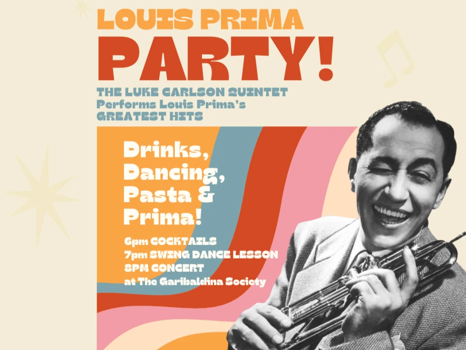 Fri. Mar 22, 2024 at 6:00pm PDT. Garibaldina MB Society, 4533 North Figueroa Street, Los Angeles, CA. Swing into Spring with an unforgettable live concert featuring the Luke Carlson Quintet, enchanting the evening with Louis Prima's greatest hits.