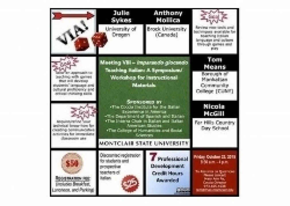 Calling all teachers of Italian language and culture! "Teaching Italian Symposium/Workshop: Meeting VIII" is right around the proverbial corner. This year's theme is "Imparando giocando"--Play and Games in the FL Classroom. To register and select your workshops--first come, first served--please go to: http://tiny.cc/TI8-giocare. Or feel free to contact me at [email protected]. Whoever said that 'professional development' can't be "all fun and games...." Hoping to see you at Montclair State on Friday, October 23rd!