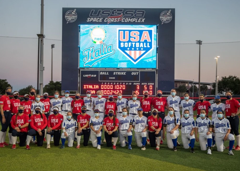 The Olympic-bound Team Italy women's softball squad got a snapshot of what they can expect to see in Tokyo when top-ranked Team USA defeated the Italians 31-3 in an eight-inning exhibition game at USSSA Space Coast Complex in Viera, Florida on April 21, 2021.
