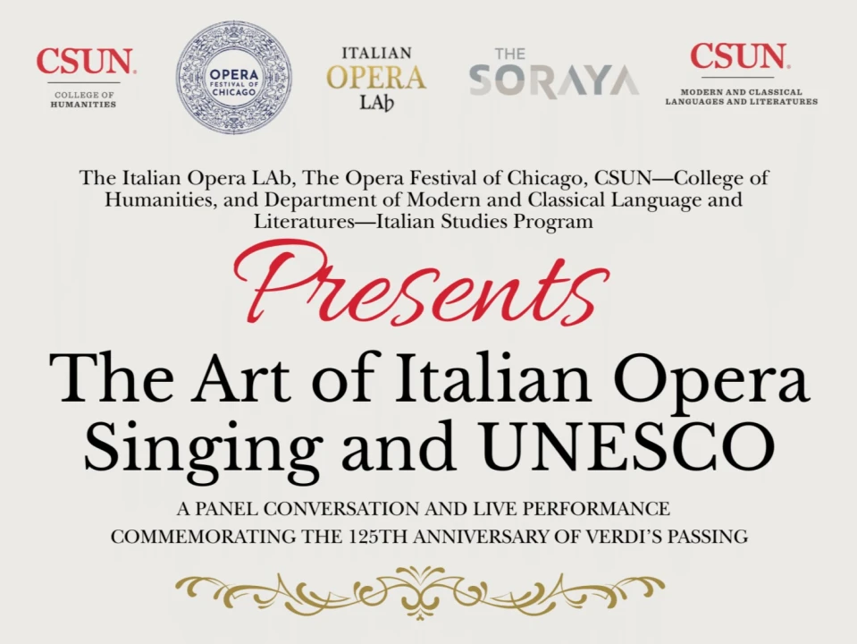 On Tuesday, March 10, 2026, from Noon till 1:30 pm, CSUN College of Humanities, Modern and Classical Languages and Literatures-Italian Studies Program, the Opera Festival of Chicago, the Italian Opera LAb, and The Soraya will present The Art of Italian Opera Singing and UNESCO. Zev Rehersal Room, The Soraya. 18111 Nordhoff Street, Northridge, CA.