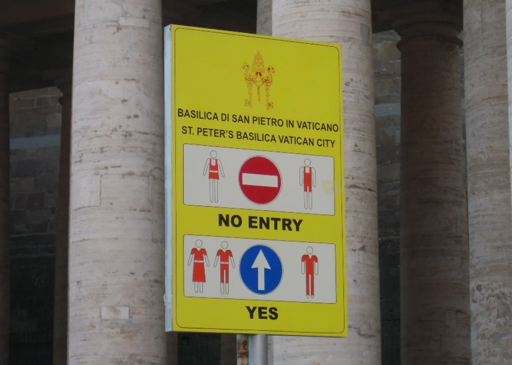 There is a dress code to visit churches in Italy: it is forbidden to enter a church (chiesa) wearing shorts or skirts above the knee, sleeveless tops, and shirts that don’t cover your belly button. Some churches display the dress code sign on the door, others do not, and some even have a person at the door to turn away those who are not dressed properly, especially at the major churches, basilicas, and cathedrals.
