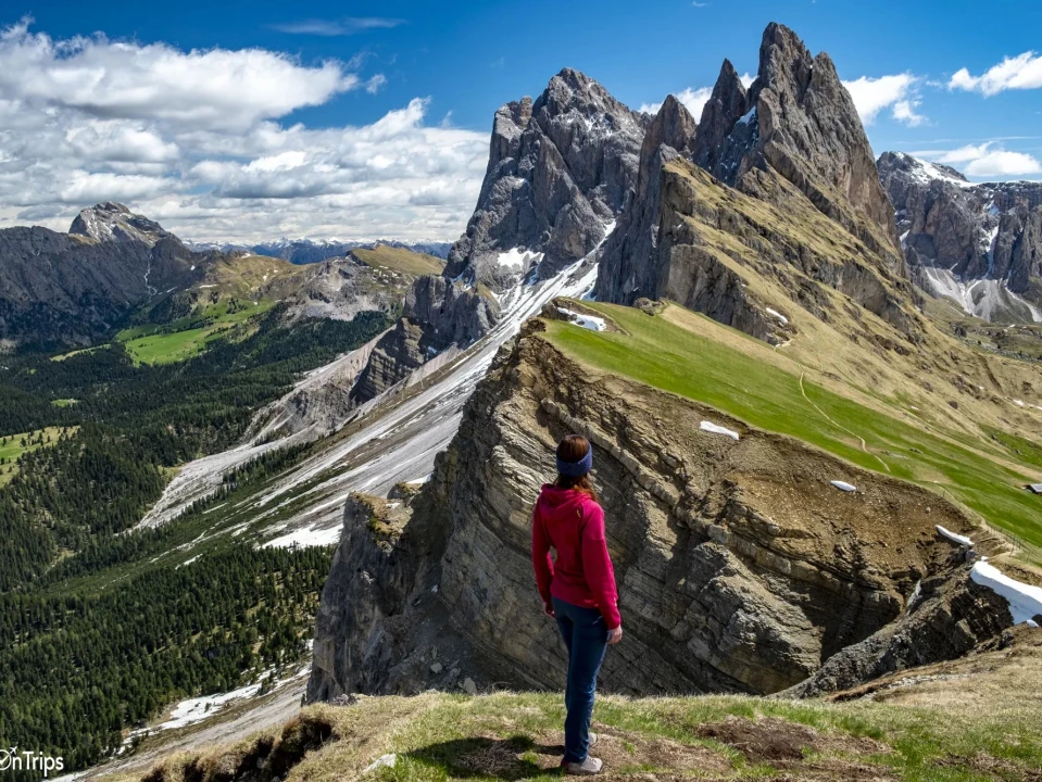 Seceda and Val Gardena – This 10 km loop in Santa Cristina, Val Gardena, is the top choice. The trail offers stunning views of the Dolomites, including the Sella Group and Sassolungo. The hike takes around 3.5 hours, with a 518-meter elevation gain. It runs from Col Raiser to Rifugio Firenze, crossing alpine meadows and reaching Forcella Pana at 2,444 meters.
