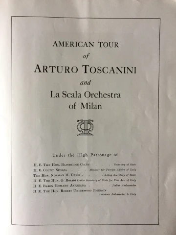 Toscanini, come si è detto, era stato l’ispiratore di queste innovazioni: era tornato dall’America quando l’Italia era entrata in guerra, e gli era stato chiesto di occuparsi della Scala, ma lui aveva risposto che la Scala era invecchiata, sembrava un museo e doveva essere profondamente rinnovata. Solo a queste condizioni si sarebbe impegnato a dirigerla nuovamente. Nell’ambito di questa ristrutturazione, che avrebbe portato poi alla riapertura del teatro nel dicembre del 1921 dopo una chiusura di 5 anni, anche se nel 1918 c’era stata una breve stagione d’opera, Toscanini fu incaricato di formare la nuova orchestra stabile. Qui si comincia a parlare della tournée e entrano in scena gli americani, che avevano salutato con disappunto la partenza di Toscanini dal Metropolitan nel 1915.