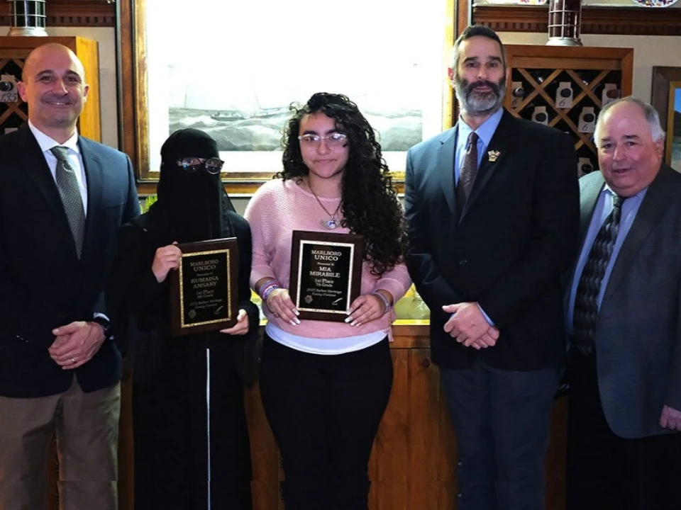 Each year the Marlborough Italian Heritage organization UNICO, hosts an essay contest for 7th and 8th graders in the Marlboro School District. This year the 7th grade, 1st Place winner was Mia Mirabile, who wrote about Italian immigration and the 8th grade, 1st Place winner was Rumaisa Ansary, who wrote about Pope Paul VI. Each received $400 and a commemorative plaque and were honored at a special dinner at the Ship Lantern Inn.