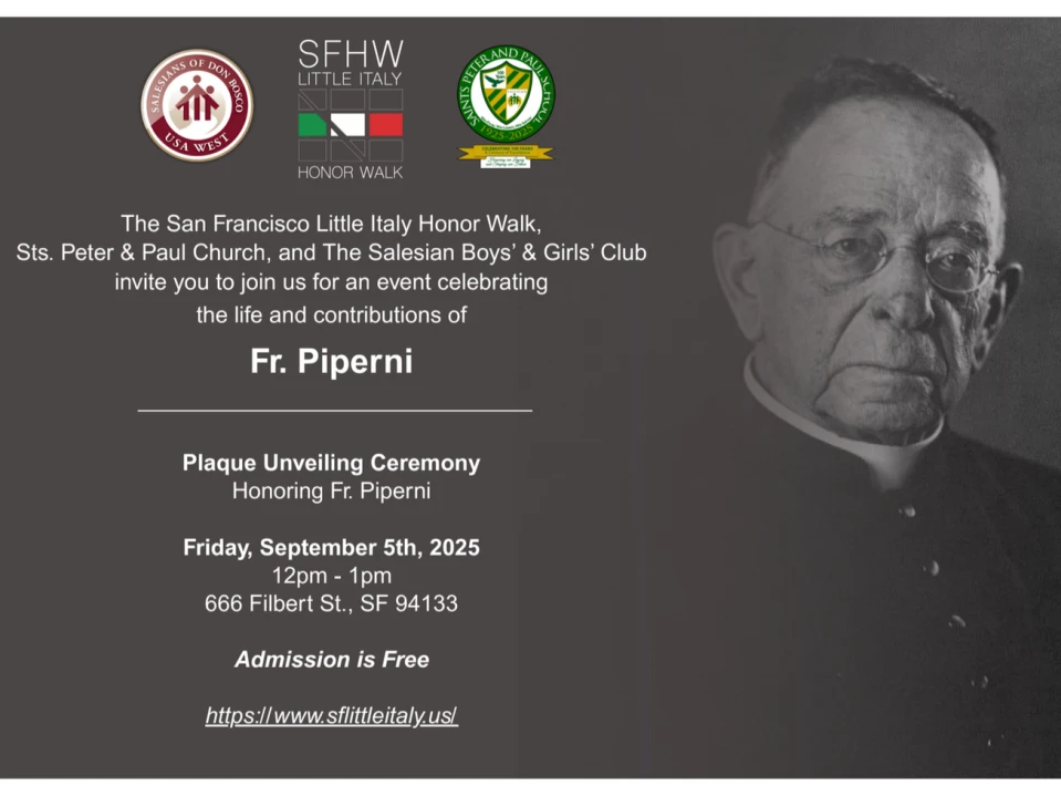 Friday, September 5, 2025. 12:00–1:00 PM. Washington Square - 666 Filbert Street, San Francisco, CA. Join us for the next celebration of Fr. Piperni! We will unveil a plaque honoring Fr. Raffaele Piperni, the first Salesian pastor of Sts. Peter & Paul Church and guiding force behind the Salesian Boys’ & Girls’ Club.