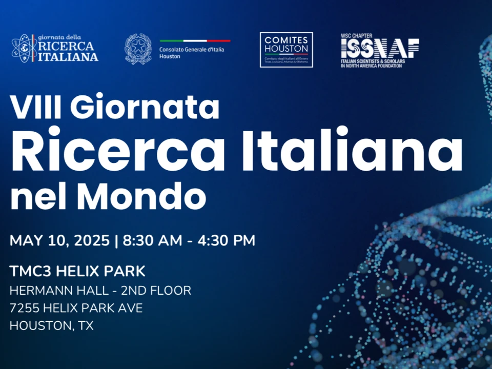 May 10th from 8:30 a.m. to 4:30 p.m. TMC3 Helix Park – Hermann Hall – 2 Floor, 7255 Helix Park Ave, Houston, TX. The Consulate General of Italy in Houston, the Comites of Houston, and the West-South Central Chapter of ISSNAF are pleased to invite you to the VIII Edition of the Italian Research Day in the World (Giornata della Ricerca Italiana nel Mondo). RSVP is mandatory, please RSVP here.