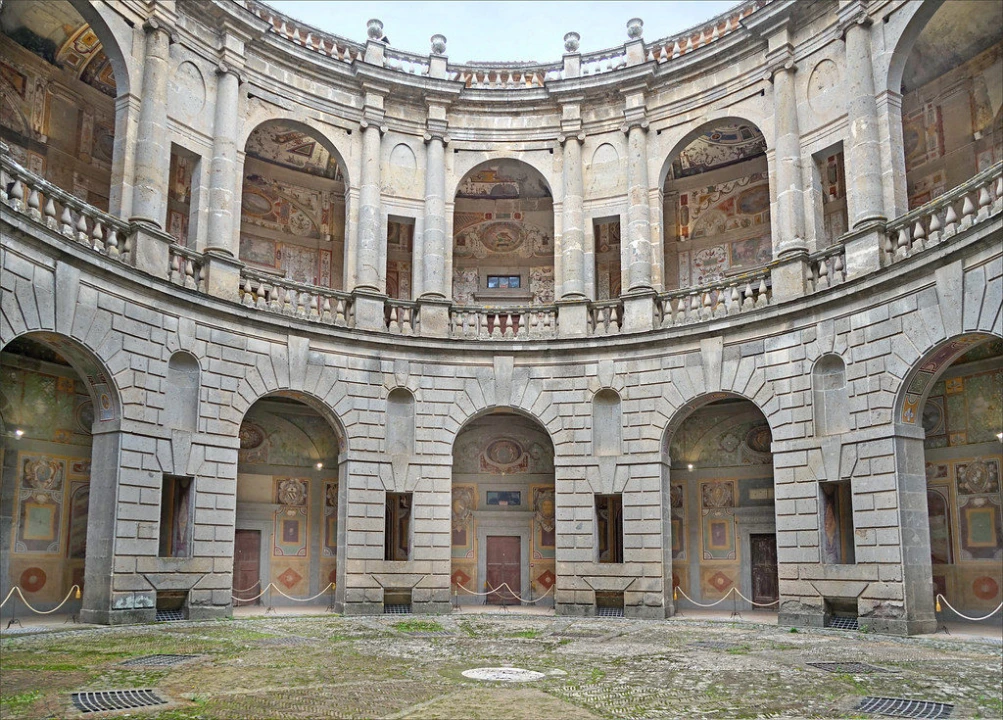 The Pope’s grandson, the eponymous Alessandro Farnese, also a cardinal, commissioned the construction of the site in the second half of the 16th century to another great architect of the age, Giacomo Barozzi da Vignola. In this second phase, the pentagonal plan was preserved, but the inner court was modified from a pentagonal plan to a circular one, and the residence changed its outlook from a defensive fortress to an aristocratic mansion to which Alessandro Farnese the Younger could retire in times in which his family was no longer popular at the court of Paul IV.