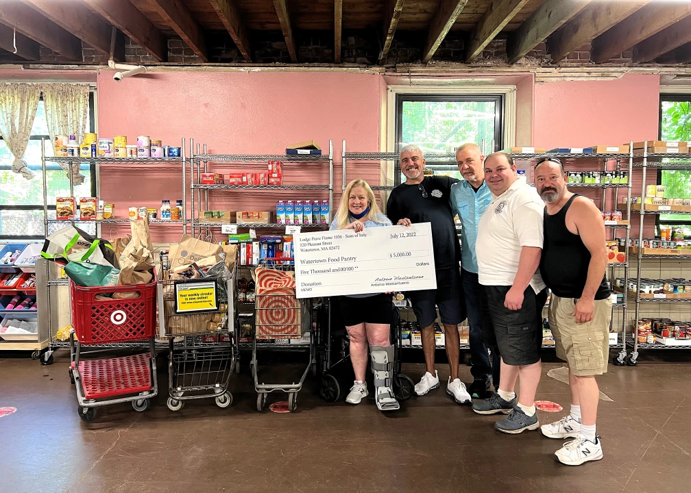 This month the Watertown Sons & Daughters of Italy Lodge Piave Fiume #1036, an affiliate Lodge of the National Order Sons of Italy in America, presented a check of $5,000 dollars to the Watertown Food Pantry, along with food items. The donation was made possible by hosting a comedy night fundraiser in June.
