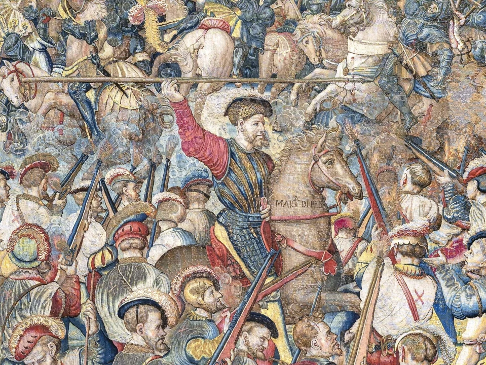 Immersive experiences are nothing new. Commemorating a battle that took place half a millennium ago, the seven panels that comprise the Pavia Tapestries — each of which is 13 feet high; taken together, the tapestries are nearly 200 feet long — have a kind of endlessness about them. Thousands of figures populate the tapestries (I dare you to find any two that are alike) and all are engaged, you might say, immersed, in survival.