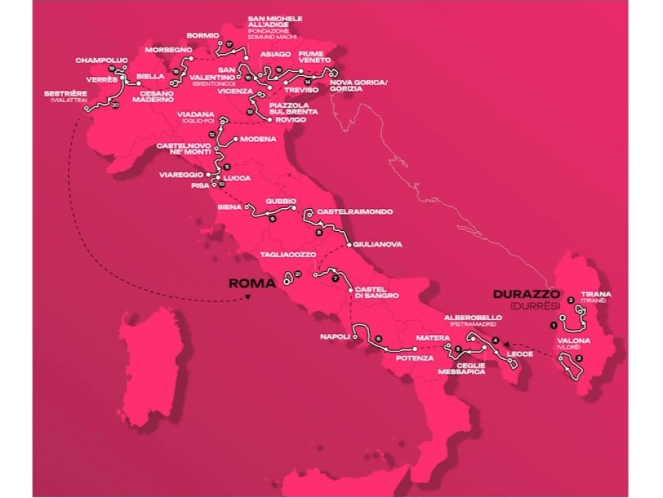 Sometimes, the Giro d'Italia starts abroad, and this year it will be the case again, with the first three stages taking place in Albania. There will be 21 stages in the Giro, including six flat stages for sprinters, eight medium mountain stages, five high mountain stages (with three summit finishes), and two time trials, for a total of nearly 3500 kilometers.