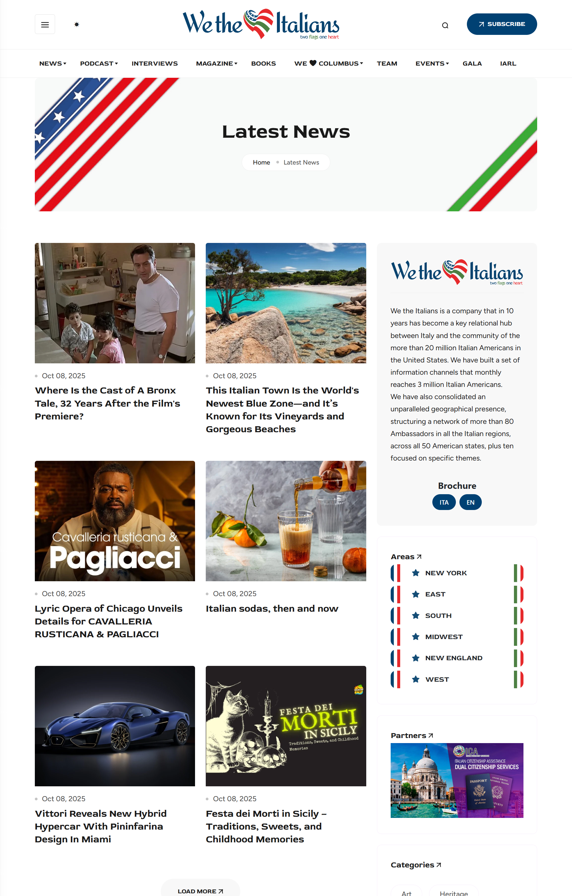 - Latest News – Updated daily and divided into eight geographic subcategories: the six U.S. areas, a general American section called From USA, and another with the news from Italy.