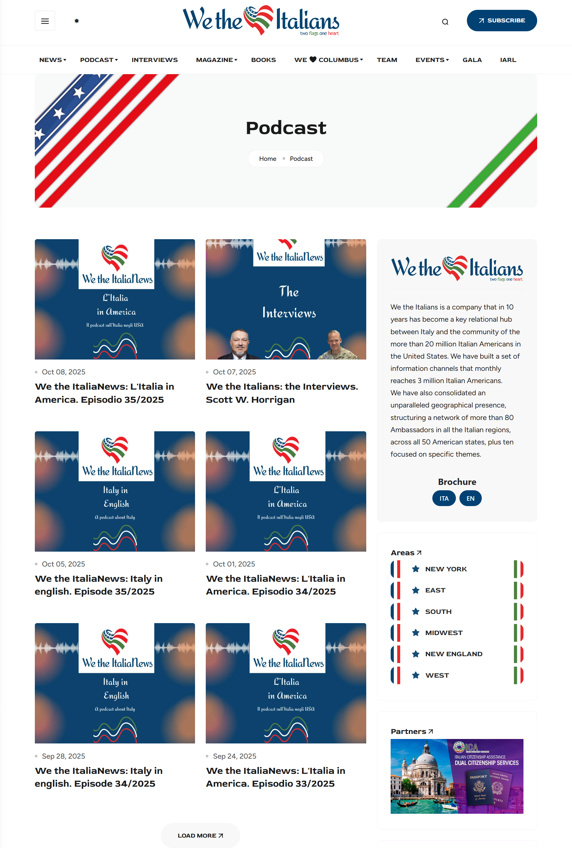- Podcast – Features our three AI-assisted podcast series: Italy in English (weekly, 8 news stories from Italy, in English); L’Italia in America (weekly, 6 news stories about Italy in America, in Italian); The Interviews (monthly, summarizing the monthly interview).