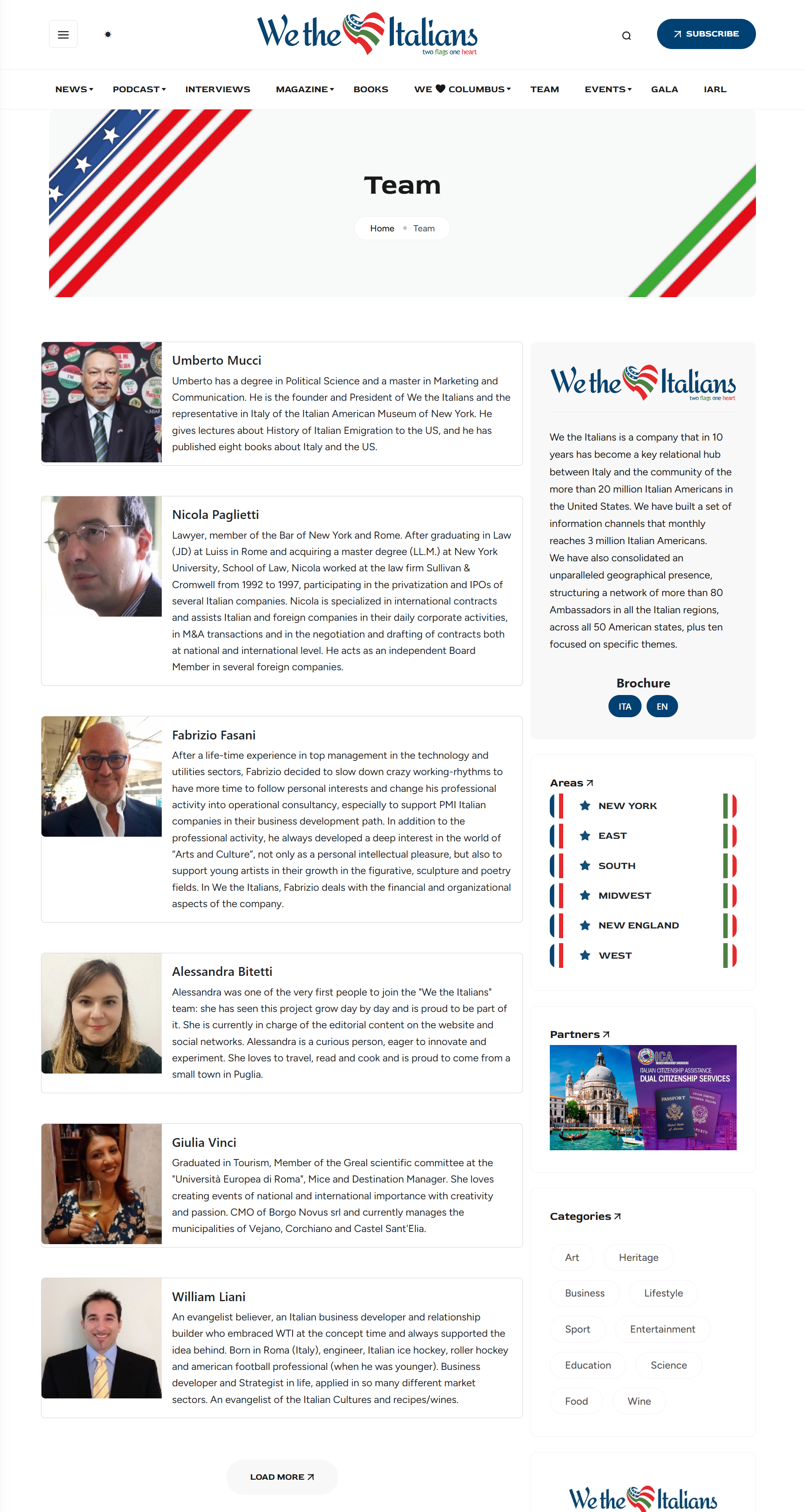 - Team – Presents everyone involved in We the Italians: from our daily collaborators to our magazine contributors, and our Ambassadors in the U.S., in Italy, and across thematic areas.