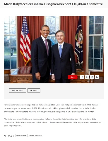 As chance would have it, that was also a historic day for another reason for We the Italians. November 9, 2012 was a Friday. It was that day, 10 years ago, that a small site began its publications. Wanted by someone who loved the United States and Italy, it was not very clear at the time what it was intended to do: almost unwittingly, it began to aggregate news about the two countries of reference, at first only news in Italian. The translation of that first news was "Made Italy/accelerates in the USA. Bisogniero: export +10.4% in 1 half year" and accompanying it was a photo of the then U.S. President, Barack Obama, with the then Italian Ambassador to Washington, Claudio Bisogniero. It was then, at that moment, that We the Italians officially started. As if we were a navigator who sets off in search of the east only to find himself in the west, we found ourselves where we are today, which is a situation I never would have imagined then: there is still a long way to go, but in the meantime on that site, which was later renovated, we host at the moment 70,512 contents about Italy and the United States. And so happy birthday to us!