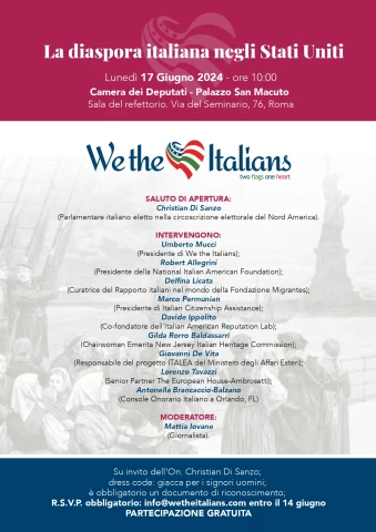 June 17, 2024 will include - in the morning - the organization of a conference at the Italian Chamber of Deputies with speakers from Italy and from the USA, dedicated to the Italian diaspora to the US. As speakers, I will have the honor to be joined by: Christian Di Sanzo (Italian Member of the Italian Parliament elected in North America); Robert Allegrini (President of the National Italian American Foundation); Delfina Licata (Curator of the Fondazione Migrantes’ Rapporto Italiani nel mondo); Marco Permunian (President of Italian Citizenship Assistance); Davide Ippolito (Co-founder of the Italian American Reputation Lab); Gilda Rorro Baldassarri (Chairwoman Emerita of the New Jersey Italian Heritage Commission); Paolo Monea (ITALEA Project, Ministry of Foreign Affairs); Antonella Brancaccio-Balzano (Italian Honorary Consul in Orlando, FL); Lorenzo Tavazzi (Senior Partner The European House-Ambrosetti). The moderator will be Mattia Iovane.