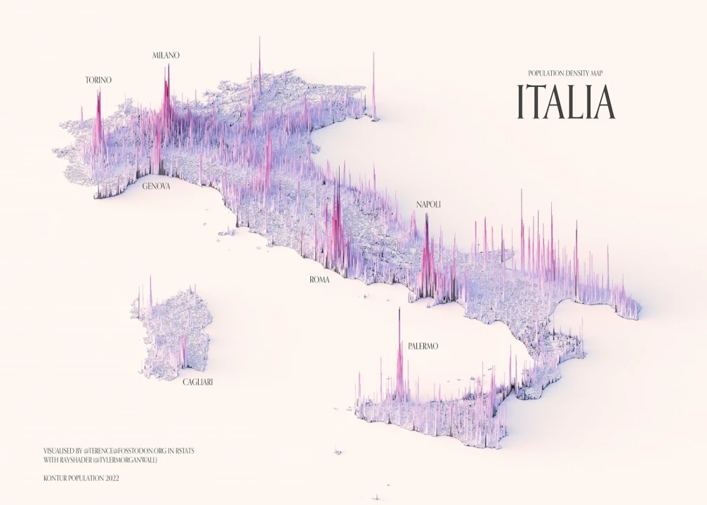 As of 2022, the Earth has 8 billion human beings. By 2050, the population is expected to grow to 10 billion. In the past 100 years, the world's population has more than quadrupled. This series of 3D maps by Terence Teo, associate professor at Seton Hall University, try to visulize the population density of six countries using open source data from Kontur Population. He used the popular R programming language and a path-tracking package, Rayshader, to create the maps of Italy.