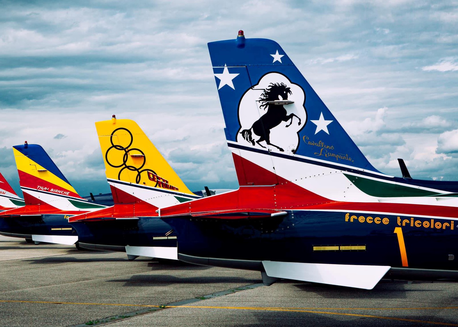 The special tails of the five Frecce Tricolori’s aircraft have been adorned with symbols and markings inspired by the “Cavallino Rampante”, “Getti Tonanti”, “Tigri Bianche”, “Diavoli Rossi” and “Lancieri Neri”, the display teams that in the 1950s were given, on a rotational basis, the task of representing the Air Force at air shows and flyovers in Italy and abroad.