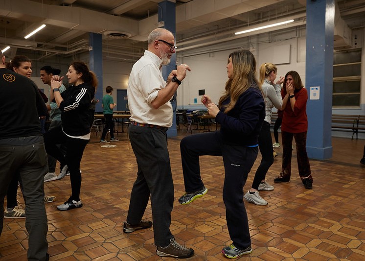 Mike Gizzo, a qualified Krav Maga instructor from the Krav Maga Institute in New York City, led participants through a round of scenarios they might run into on the streets, from being grabbed from behind, to being cornered with a knife. In the large theater of Our Lady of Pompeii Church, the church founded in 1892 by Scalabrini Fathers, to serve the Italian-American immigrants who settled in the Greenwich Village, the participants were paired with one another and took turns as the assailant or the defender.