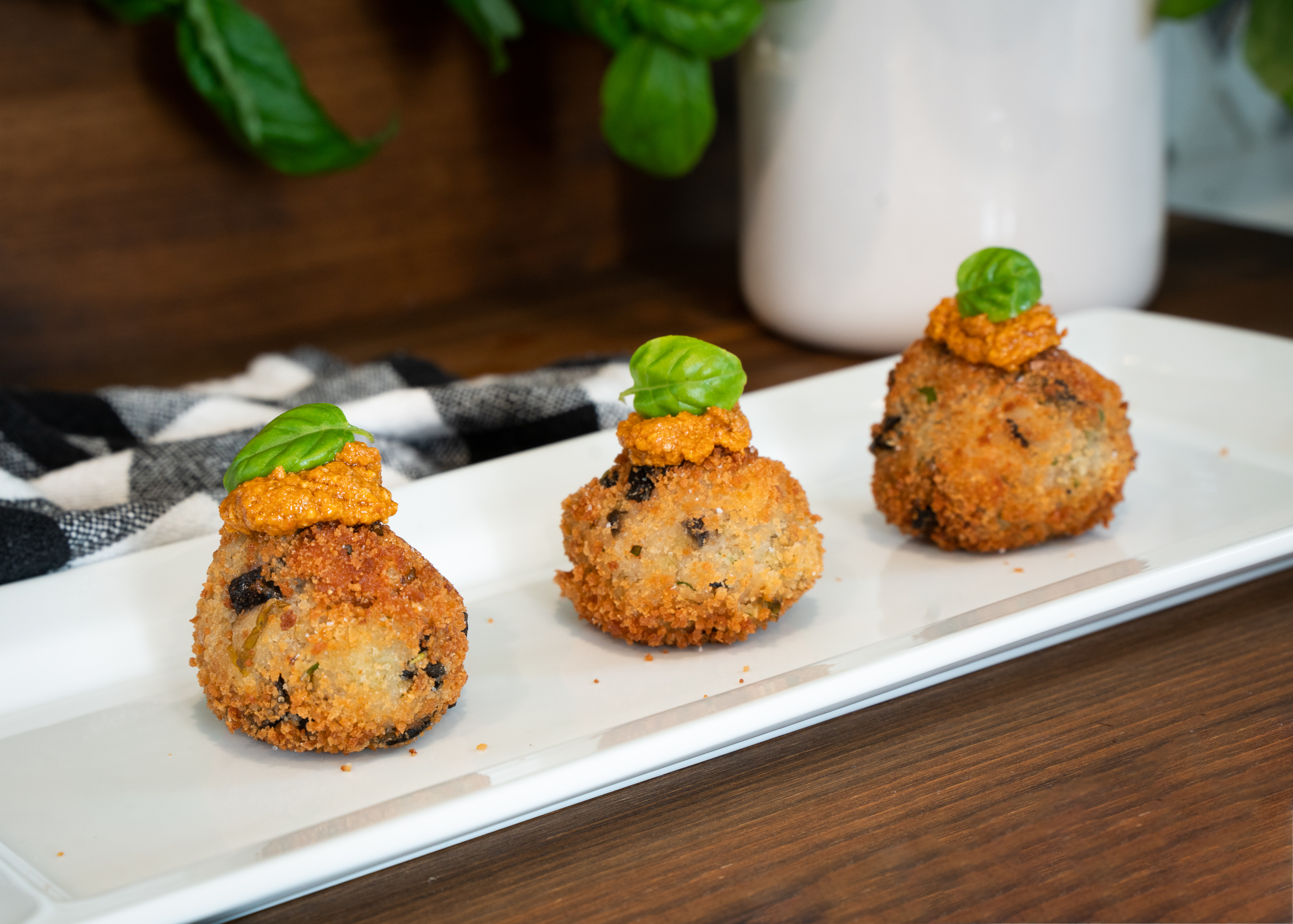 - To serve, place croquettes on a platter, and drop 1/2 tablespoon of pesto on top of each one.